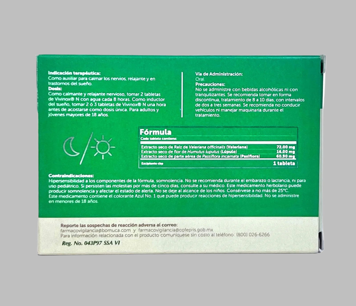 This herbal medication contains all-natural ingredients such as valerian, passionflower, and hop. These ingredients have been traditionally used to promote relaxation and alleviate mild anxiety and insomnia. With 40 tablets per box, Vivinox-N is a natural, non-habit forming option for those seeking a sense of calm and rest.