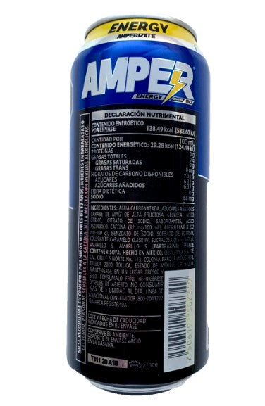 Boost your energy levels with 4-Pk Amper Energy Drink. This Mexican carbonated drink is infused with caffeine to provide you with a quick pick-me-up. Each can contains 473ml/15.99 fl oz, giving you the perfect amount to fuel your day. Say goodbye to sluggishness and hello to productivity with Amper Energy Drink.