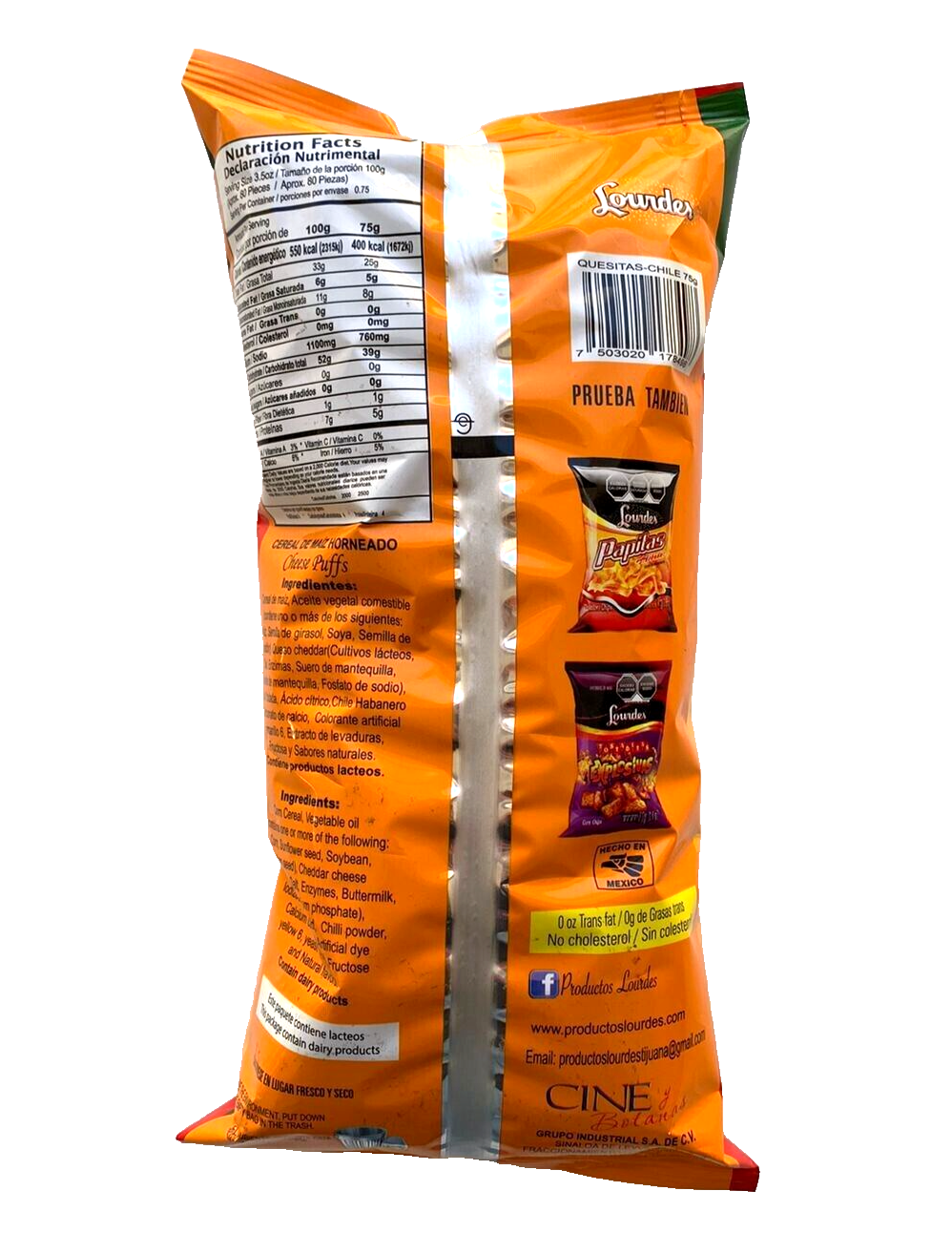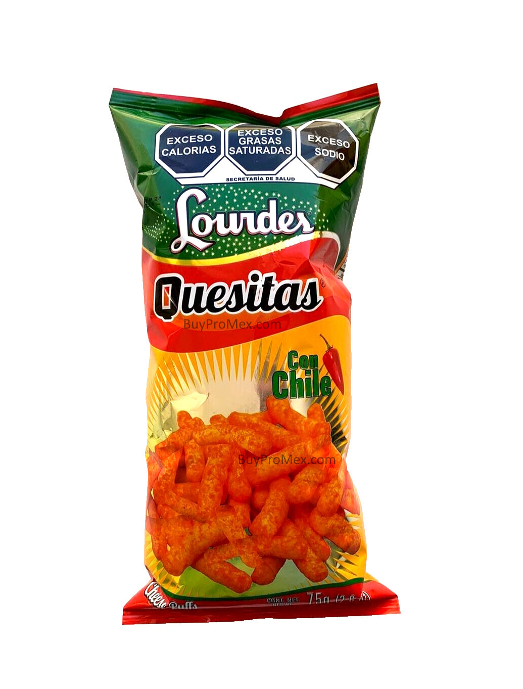Indulge in the rich, bold flavors of Mexico with our 5-pack of Lourdes Quesitas Con Chile. Each bite is a sensory experience, with the perfect blend of spicy chili and creamy cheese, encased in a light and crispy puff. Elevate your snacking game with Lourdes Cheesy Puffs and satisfy your cravings in an exclusive and delicious way.