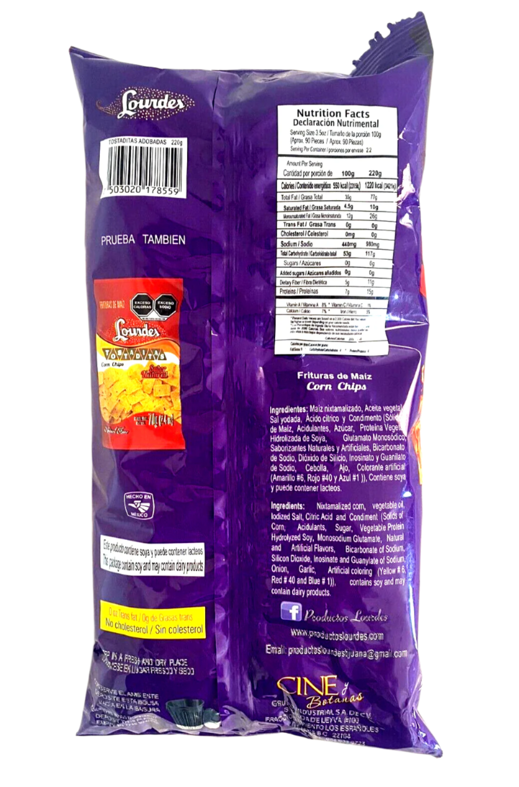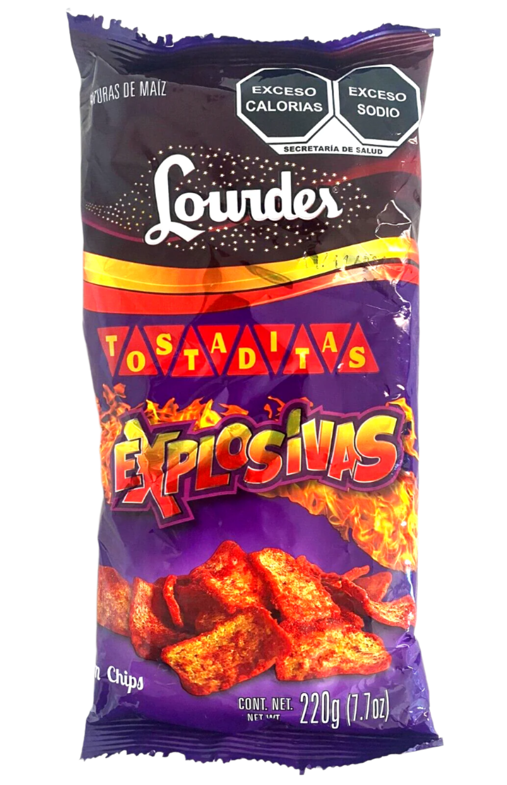 Introducing Lourdes Explosive Spicy HOT Tostaditas - a pack of 5 spicy tortilla chips weighing 220g/7.7oz each. Experience the fiery explosion of flavor with each bite! Made with authentic spices, these chips are perfect for those who love a little heat in their snacks.