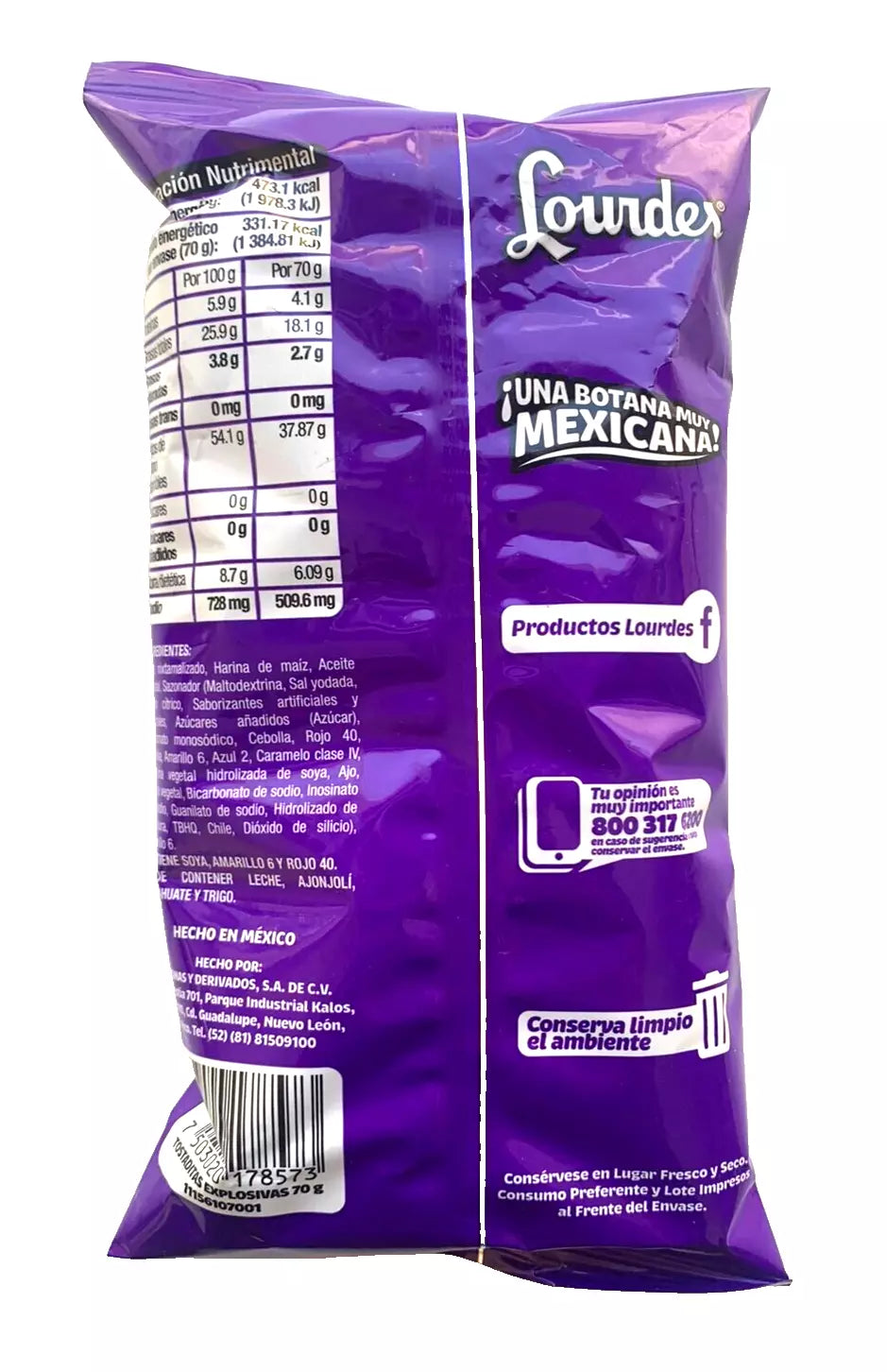 These 8-Pk Lourdes Tostaditas Explosivas are the perfect combination of Mexican tortilla chips and explosive hot flavor. Each tostadita weighs 70g/2.46oz and delivers an intense burst of heat with every bite. With this pack, you can enjoy these fiery chips anytime, anywhere. Savor the unique taste of these Lourdes Explosive HOT tostaditas and spice up your snacking game.