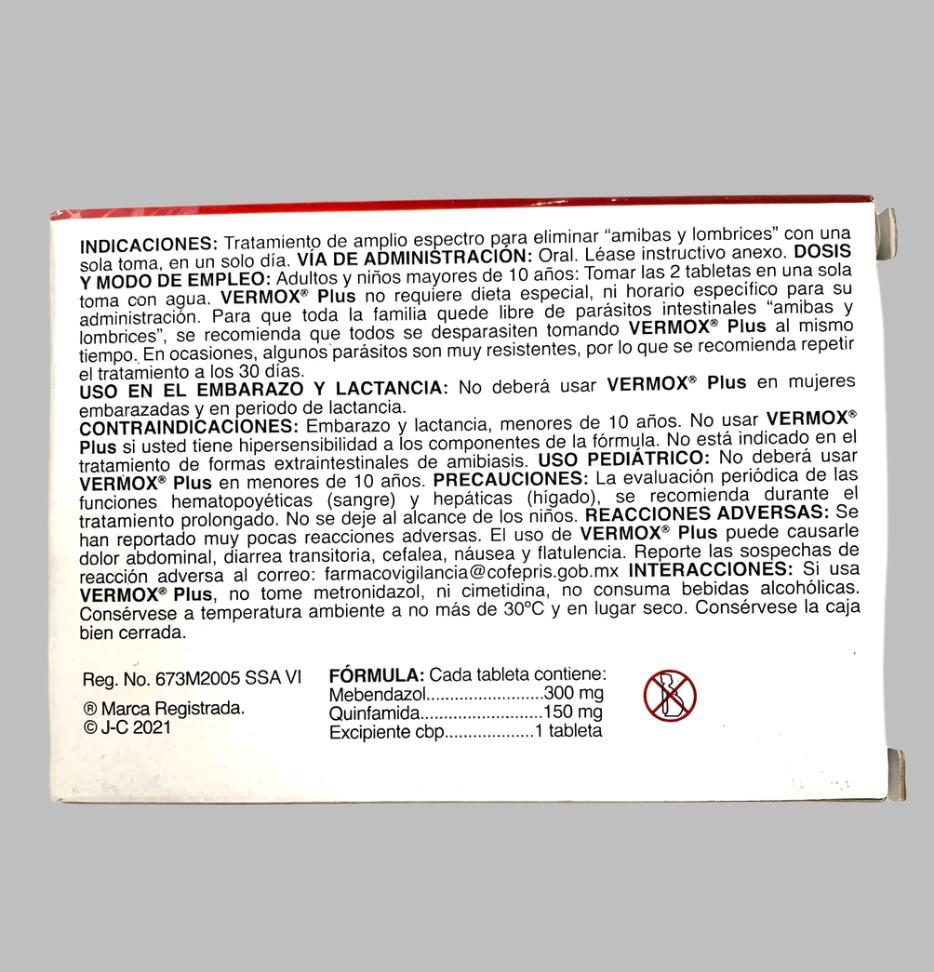 Vermox (Mebendazole)(Quinfamide) Adult Tablets effectively treat parasites and worms with 300mg of Mebendazole and 150mg of Quinfamide. This Mexican over the counter medication is a reliable and proven solution for fighting against unwanted infections. Keep your body healthy with Vermox.